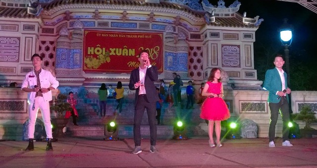 HNN.VN - “Đón xuân” là chương trình ca múa nhạc tổng hợp được tổ chức tại sân khấu Bia Quốc Học, Công viên Lý Tự Trọng vào tối mùng 2 tết (17/2).