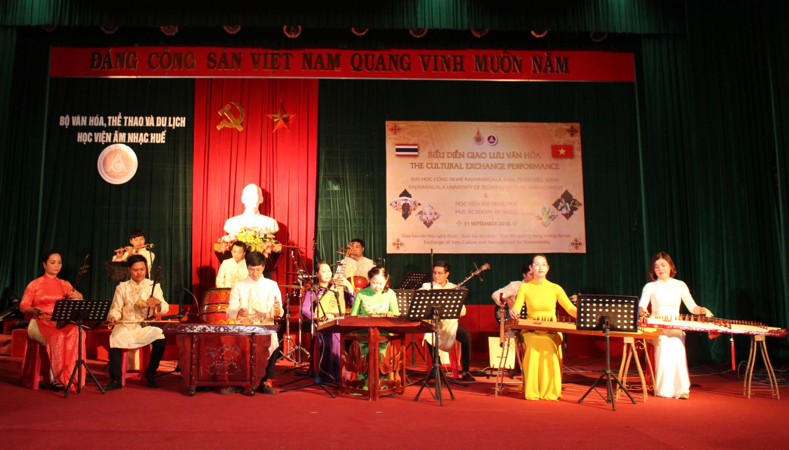 Tại chương trình, các giảng viên, sinh viên HVAN Huế biểu diễn 5 tiết mục hòa tấu, độc tấu nhạc cụ dân tộc (Lý ngựa ô Huế, Kể chuyện ngày mưa, Vui hội ngộ, Lý hoài Nam, Tình khúc đêm trăng). Đáp lại thịnh tình, phái đoàn của Trường đại học Công nghệ Rajamangala Isan biểu diễn 5 vũ điệu truyền thống Thái Lan (Apsara, Ma muad, Voi Round-up, Mantis, Pestle) và 1 tiết mục nhạc sống truyền thống.