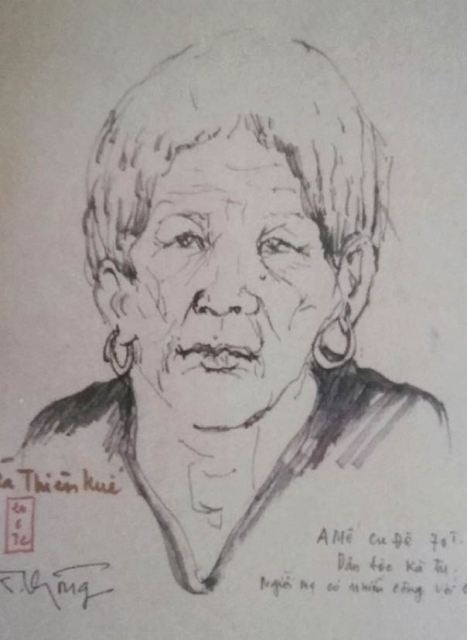 Có 12 bức ký họa chân dung và sinh hoạt của đồng bào dân tộc Ka Tu tham gia cách mạng. Trong đó thật bất ngờ có chân dung của đồng chí Quỳnh Trên (màu nước, vẽ năm 1971), Chủ tịch Quận 4, sau này là Bí thư Huyện ủy A Lưới; anh Hồ Thời (thuốc nước, vẽ năm 1971), lúc đó 15 tuổi, dùng súng trường bắn rơi máy bay AD6 Mỹ, sau này là Phó Chủ tịch UBND huyện A Lưới; A Mế Cu Đê (bút sắt, 1972), người có công cách mạng; Cu Tuôl (bút dạ, 1971), dũng sĩ diệt Mỹ; Kăn Prit (màu nước, 1971), cán bộ phụ nữ Quận 4; O văn công dân tộc Ka Tu (bút sắt, 1972); Cu Axở (màu nước, 1971), chiến sĩ quân y viện Quận 4; Kăn Pêr (màu nước, 1971), cá nhân xuất sắc nhất trong sản xuất, đóng góp cho cách mạng… Nhiều bức tranh vẽ các hoạt động trong kháng chiến: Bà con dân tộc Ka Tu trong Đại hội miền Tây (bút sắt, 1971), Bản Kà Đồng giải phóng (màu nước, 1971), Không cho địch vào cửa rừng (bút dạ, 1972), Nhà ở căn cứ (thuốc nước, 1972)…
