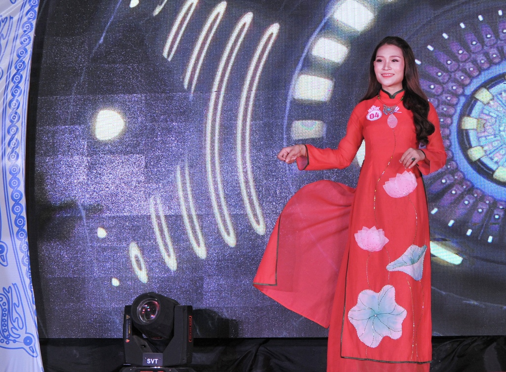 Quỳnh Nga (xã Hương Giang) với áo dài thêu hoa sen