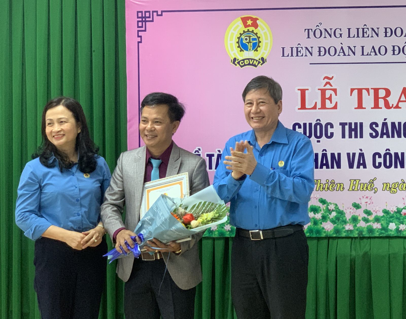 Phó Chủ tịch Thường trực Tổng LĐLĐ Việt Nam Trần Thanh Hải và Chủ tịch LĐLĐ tỉnh Nguyễn Khoa Hoài Hương trao giấy chứng nhận cho tác giả đoạt giải Nhì cuộc thi