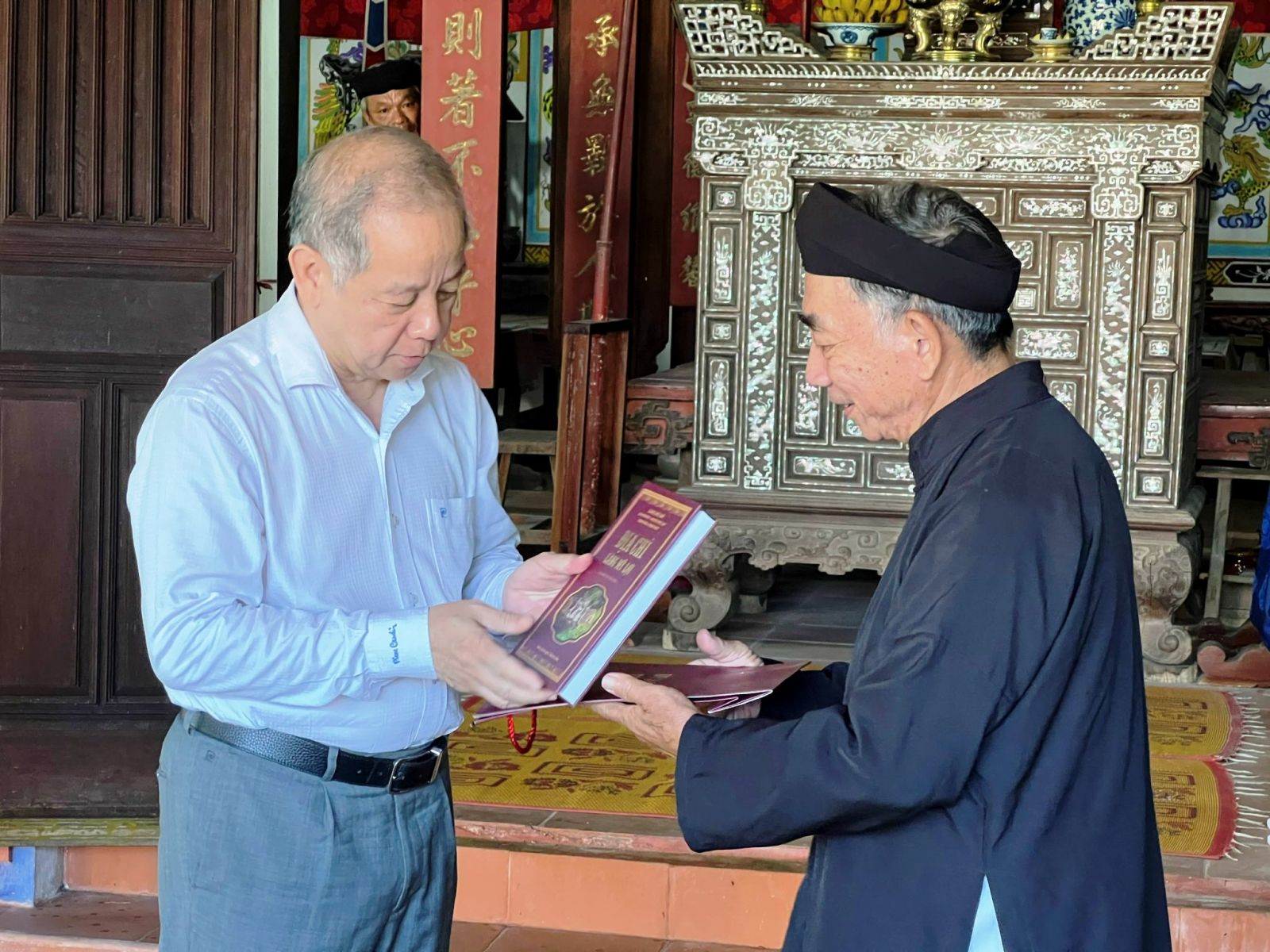 Một bậc cao niên tặng Dư địa chí làng Mỹ Lợi đến Phó Bí thư Thường trực Tỉnh ủy Phan Ngọc Thọ