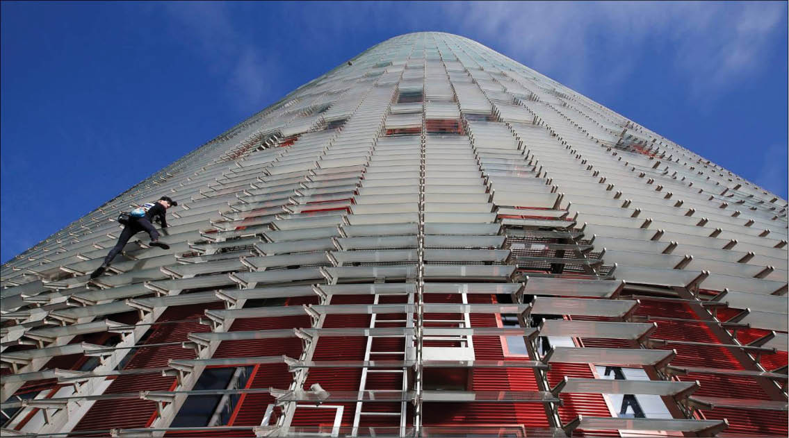 “Người nhện” Alain Robert trong lần chinh phục một toà nhà ở Barcelona năm 2016. Ảnh: REUTERS