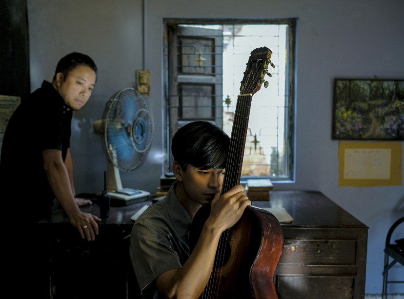 Đạo diễn Victor Vũ (trái) với diễn viên chính vai Ngạn trong một phân cảnh của “Mắt biếc”. Ảnh: ĐOÀN LÀM PHIM CUNG CẤP