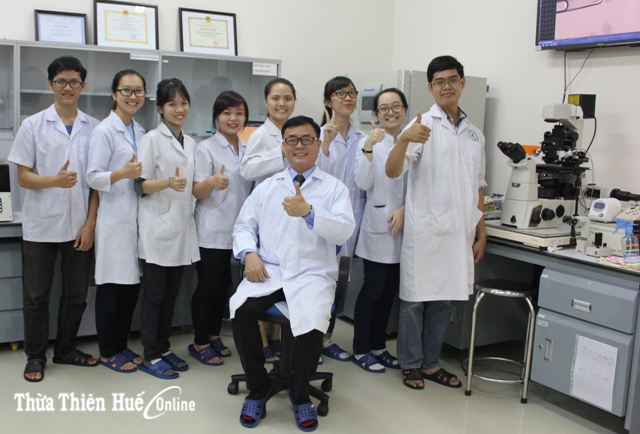 PGS.TS Nguyễn Văn Thuận cùng sinh viên sau đại học tại phòng thí nghiệm tái lập chương trình tế bào. (Ảnh: Nhân vật cung cấp)