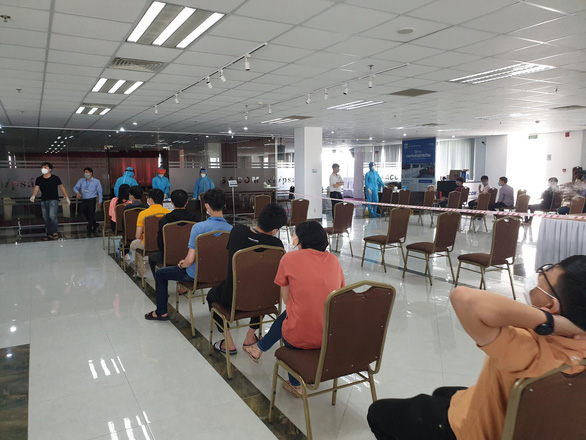 Người lao động ở Khu công nghệ cao TP.HCM (TP Thủ Đức) ngồi xếp hàng chờ lấy mẫu xét nghiệm tầm soát COVID-19 - Ảnh: CTV