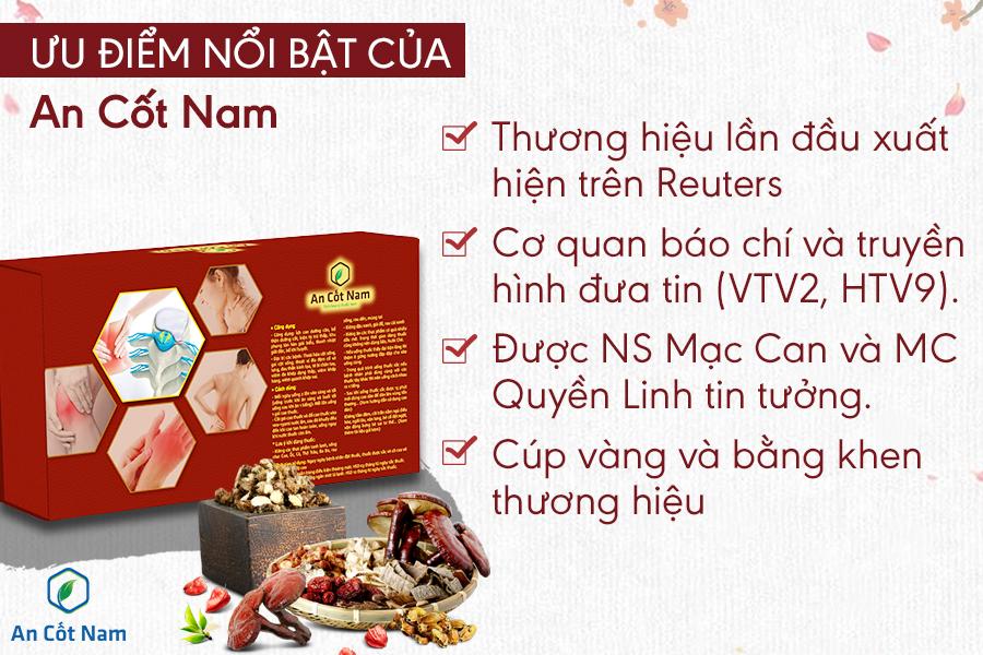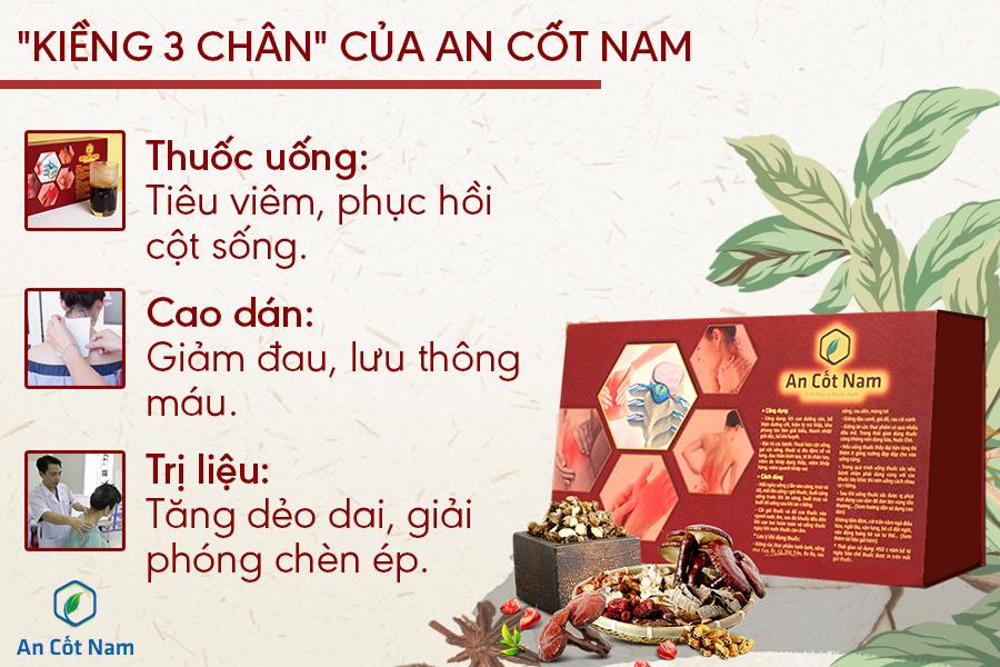 Bên cạnh đó, đây còn là bài thuốc đông y hiếm hoi biết tận dụng được sức mạnh của các liệu pháp từ thuốc uống, cao dán, bài tập đến vật lý trị liệu,... tạo thành một phác đồ “Kiềng 3 chân” hoàn chỉnh, bổ trợ nhau để cho ra hiệu quả cuối cùng. Đây cũng là điểm mấu chốt thuyết phục được bác sĩ Toàn (Bệnh viện 108) và giới chuyên gia để giới thiệu An Cốt Nam cho bà con cả nước trong chương trình “Sống khỏe mỗi ngày” - VTV2.