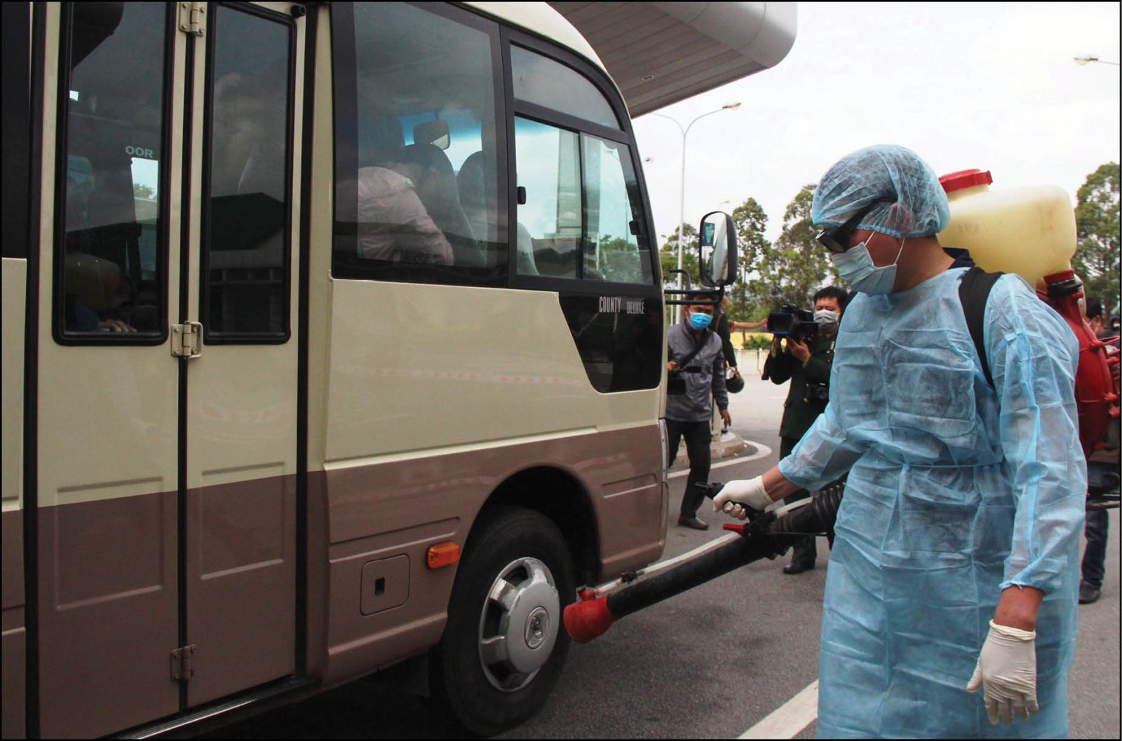 Các phương tiện đưa đón người trở về từ vùng dịch được phun thuốc tiêu độc, khử trùng như kế hoạch diễn tập
