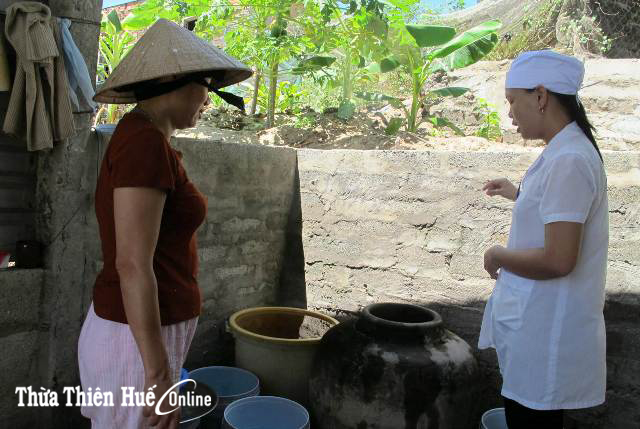 Cán bộ Trạm Y tế thị trấn Thuận An kiểm tra tư vấn diệt trừ loăng quăng phòng dịch sốt xuất huyết