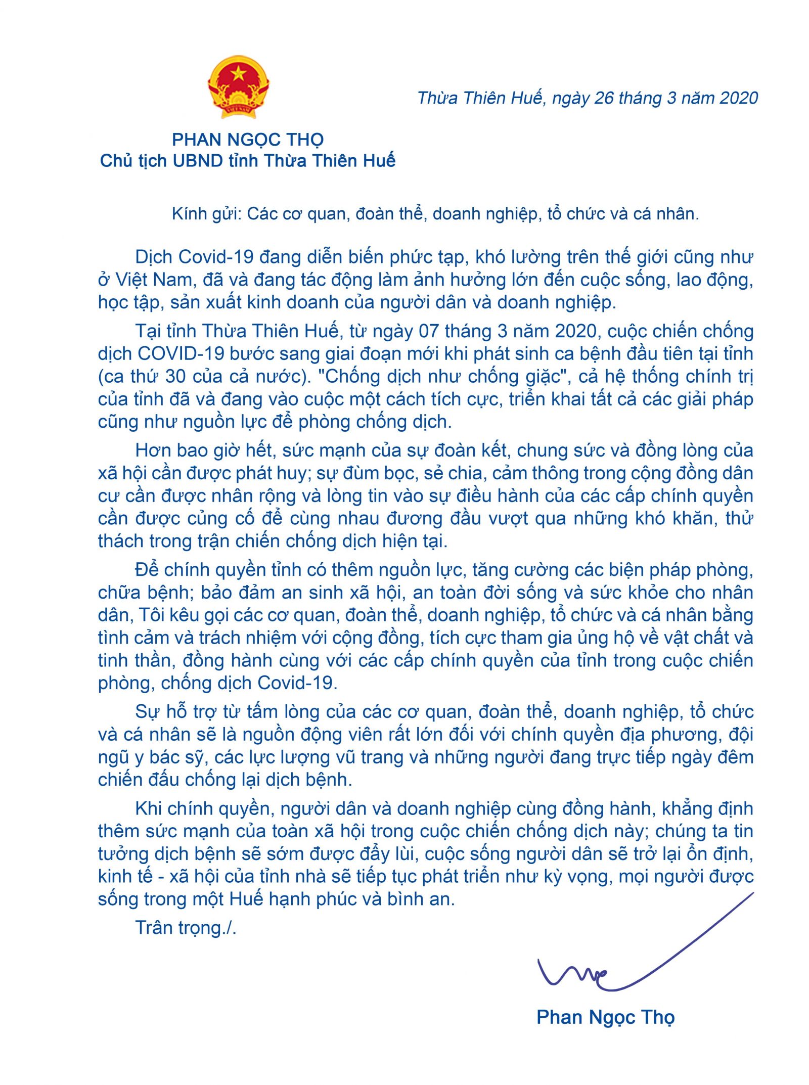 “Để chính quyền tỉnh có thêm nguồn lực, tăng cường các biện pháp phòng, chữa bệnh; bảo đảm an sinh xã hội, an toàn đời sống và sức khỏe cho nhân dân, tôi kêu gọi các cơ quan, đoàn thể, doanh nghiệp, tổ chức và cá nhân bằng tình cảm và trách nhiệm với cộng đồng, tích cực tham gia ủng hộ về vật chất và tinh thần, đồng hành cùng với các cấp chính quyền của tỉnh trong cuộc chiến phòng, chống dịch Covid-19”- bức thư viết.