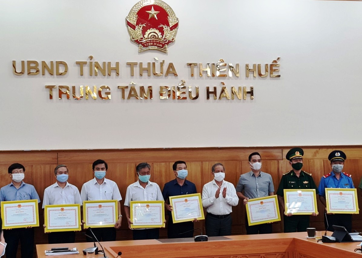 Chủ tịch UBND tỉnh Phan Ngọc Thọ trao Bằng khen cho các tập thể tại điểm cầu Văn phòng UBND tỉnh