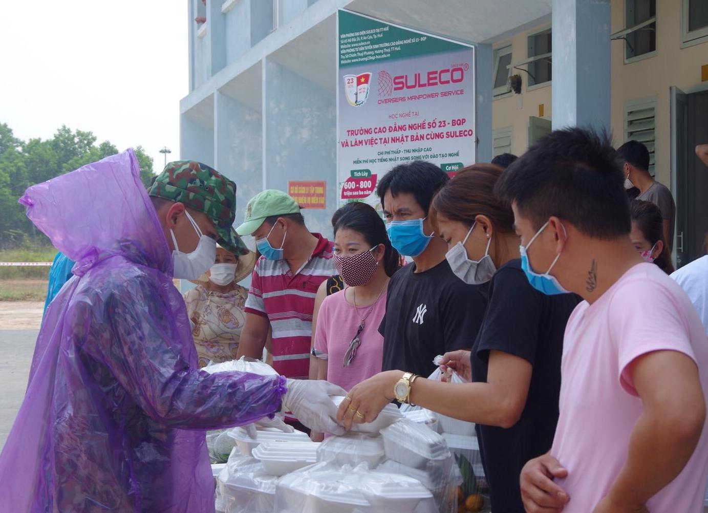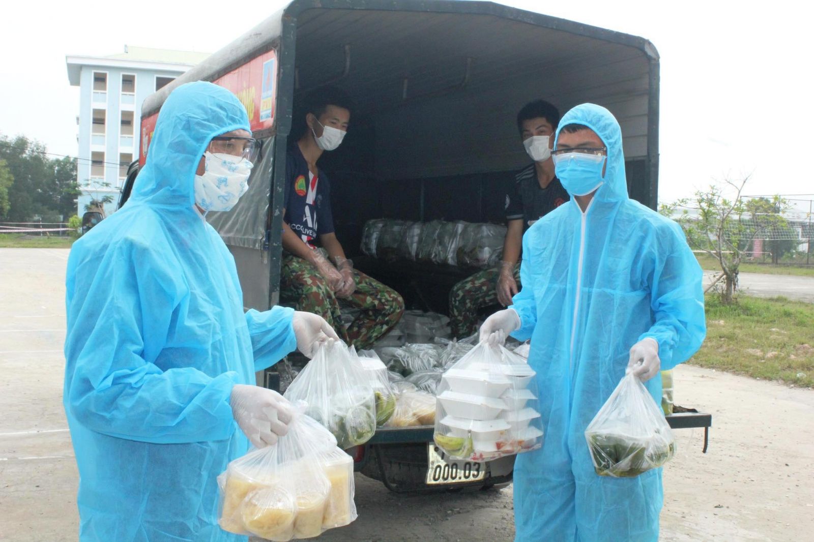 Sau khi được chia theo khẩu phần, những người lính tiếp tục với công việc vận chuyển cơm tới khu vực cách ly