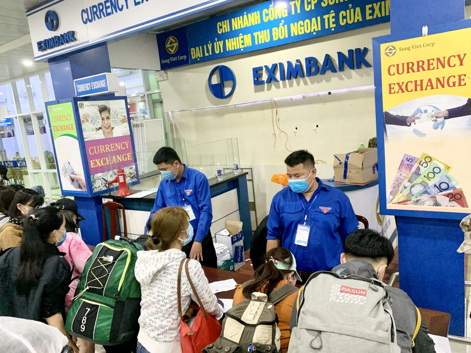 Tình nguyện viên hướng dẫn khai báo y tế tại Sân bay Phú Bài