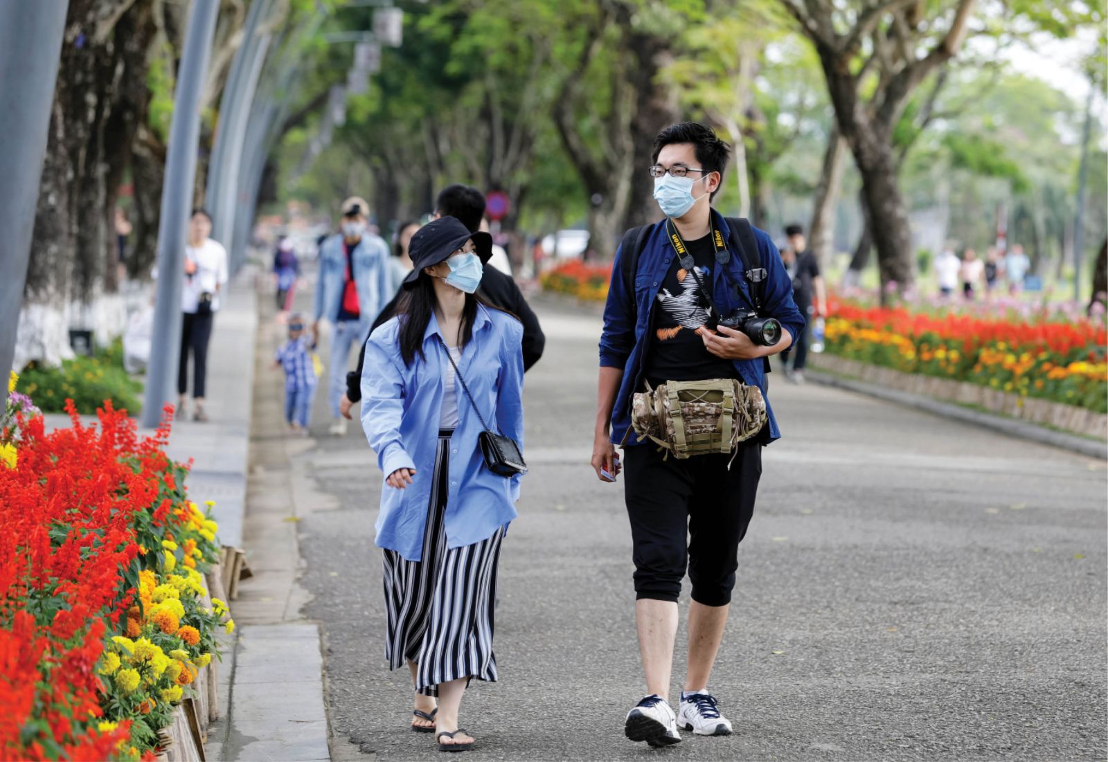 Du khách đeo khẩu trang tham quan Huế. Ảnh: PN