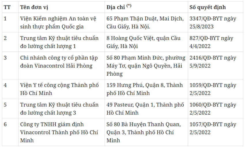 Cục An toàn thực phẩm (Bộ Y tế) đã công bố danh sách 6 cơ quan kiểm tra nhà nước về an toàn thực phẩm nhập khẩu được Bộ Y tế giao và chỉ định.