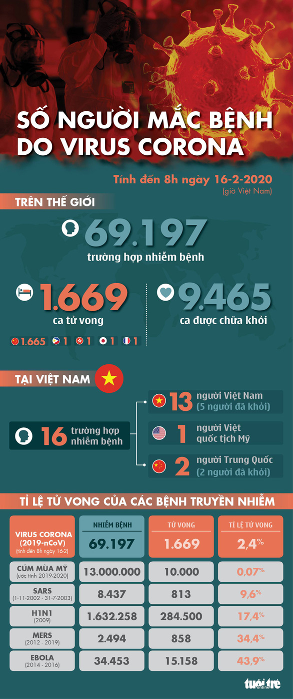 Trước đó sáng sớm 16-2, theo thống kê của báo South China Morning Post, tính đến 6h ngày 16-2, toàn thế giới có 69.031 ca nhiễm virus corona chủng mới, 1.666 trường hợp tử vong và 8.142 người đã hồi phục.