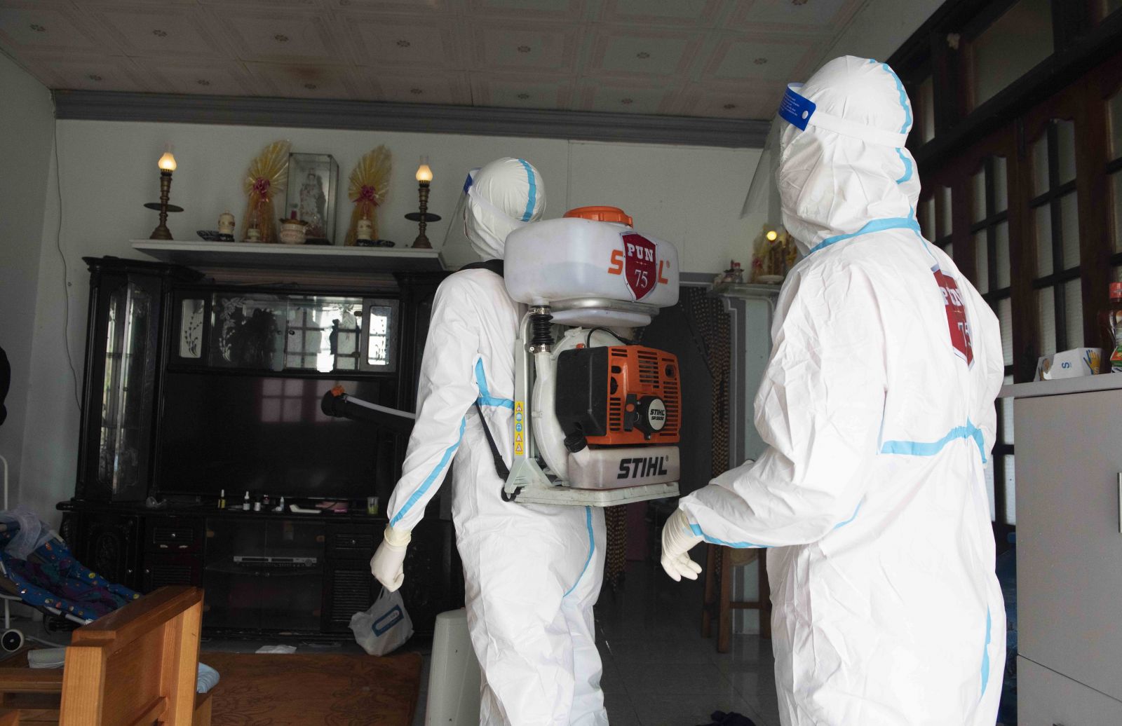 PUN75 đang tiến hành phun khử khuẩn căn nhà có F0. Ảnh: Trương Vững