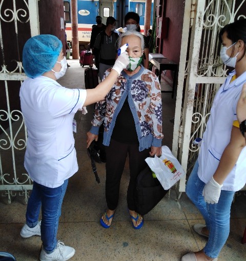 Tất cả hành khách khi xuống tàu tại Ga Huế đều được đo thân nhiệt và hướng dẫn khai báo y tế