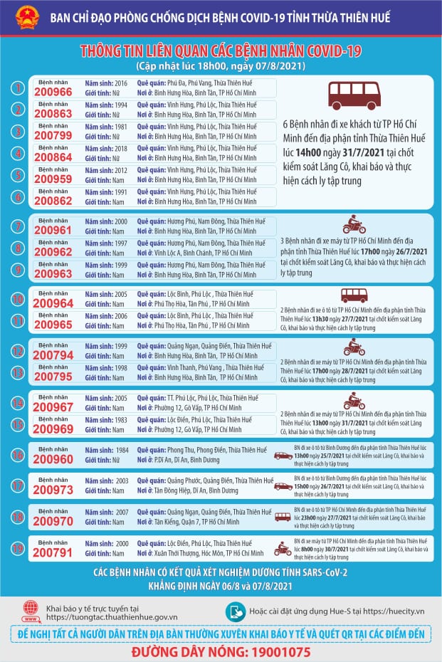 Đó là các bệnh nhân mang số hiệu 200966, 200863, 200799, 200864, 200959, 200862, 200961, 200962, 200963, 200964, 200965, 200794, 200795, 200967, 200969, 200960, 200973, 200970, 200791. Tất cả các bệnh nhân này đều về từ vùng dịch bằng xe máy, ô tô hoặc tàu hỏa và được cách ly, lấy mẫu xét nghiệm.