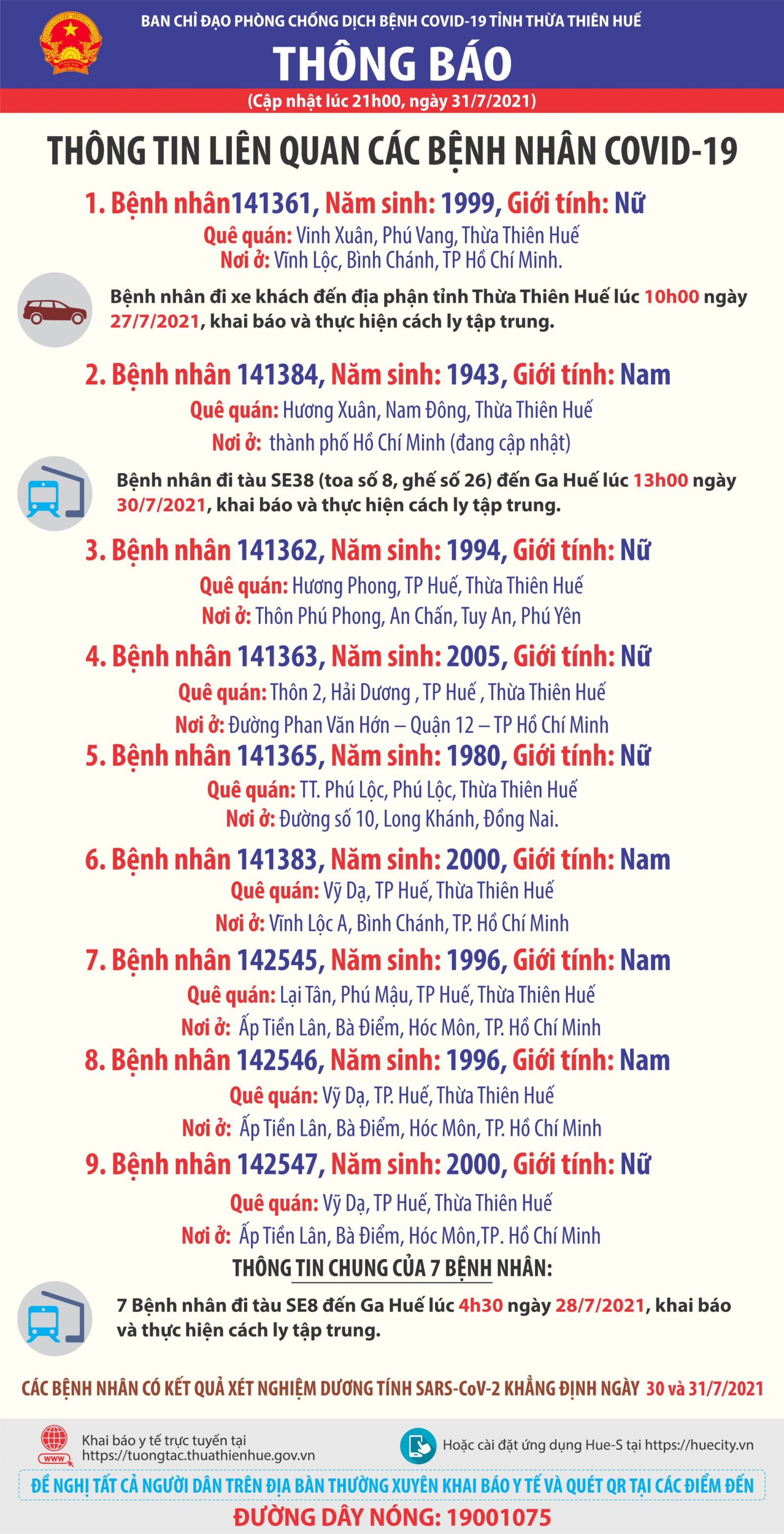 Trong số 9 bệnh nhân mới phát hiện có 8 bệnh nhân về quê bằng tàu hỏa, đến ga Huế khai báo và được cách ly tập trung; bệnh nhân còn lại về Huế bằng xe khách.