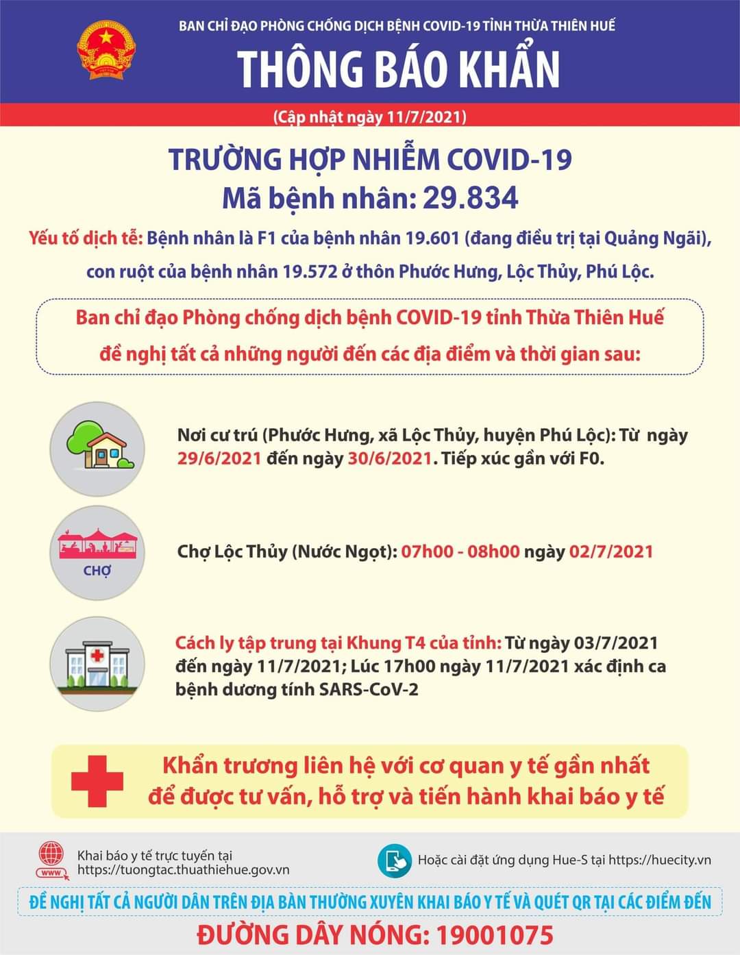 Bệnh nhân này chưa được Bộ Y tế công bố, nhưng đã được Bộ gắn mã bệnh 29.834. Đây là trường hợp F1 của ca bệnh 19.601 (đang điều trị tại Quảng Ngãi), đồng thời là con ruột của bệnh nhân 19.572 ở thôn Phước Hưng, Lộc Thủy, Phú Lộc. Đây là trường hợp dương tính với SARS-CoV-2 thứ 7 được Thừa Thiên Huế ghi nhận kể từ 27/4 đến nay.