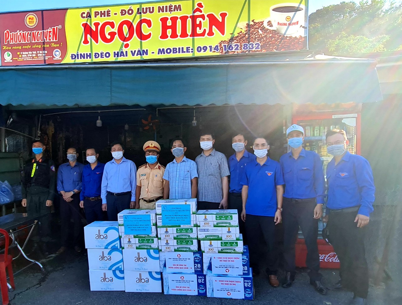 Lực lượng đoàn viên thanh niên cùng các mạnh thường quân tặng quà cho chốt kiểm soát trên đỉnh đèo Hải Vân