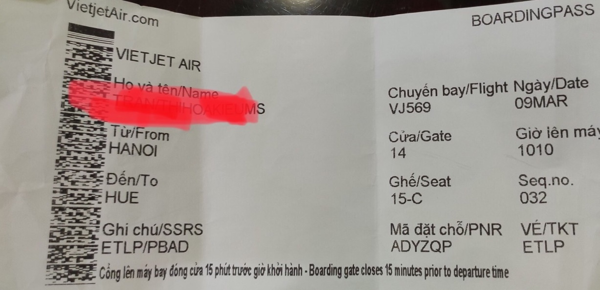 Tiếp đó, 10h10 ngày 9/3, bà K. đáp chuyến bay VJ569 của hãng hàng không Vietjet từ sân bay Nội Bài đến sân bay Phú Bài (Huế).