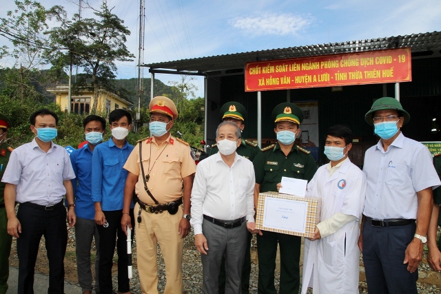 Phó Bí thư Thường trực Tỉnh ủy Phan Ngọc Thọ trao quà, động viên lực lượng làm nhiệm vụ tại chốt liên ngành xã Hồng Vân