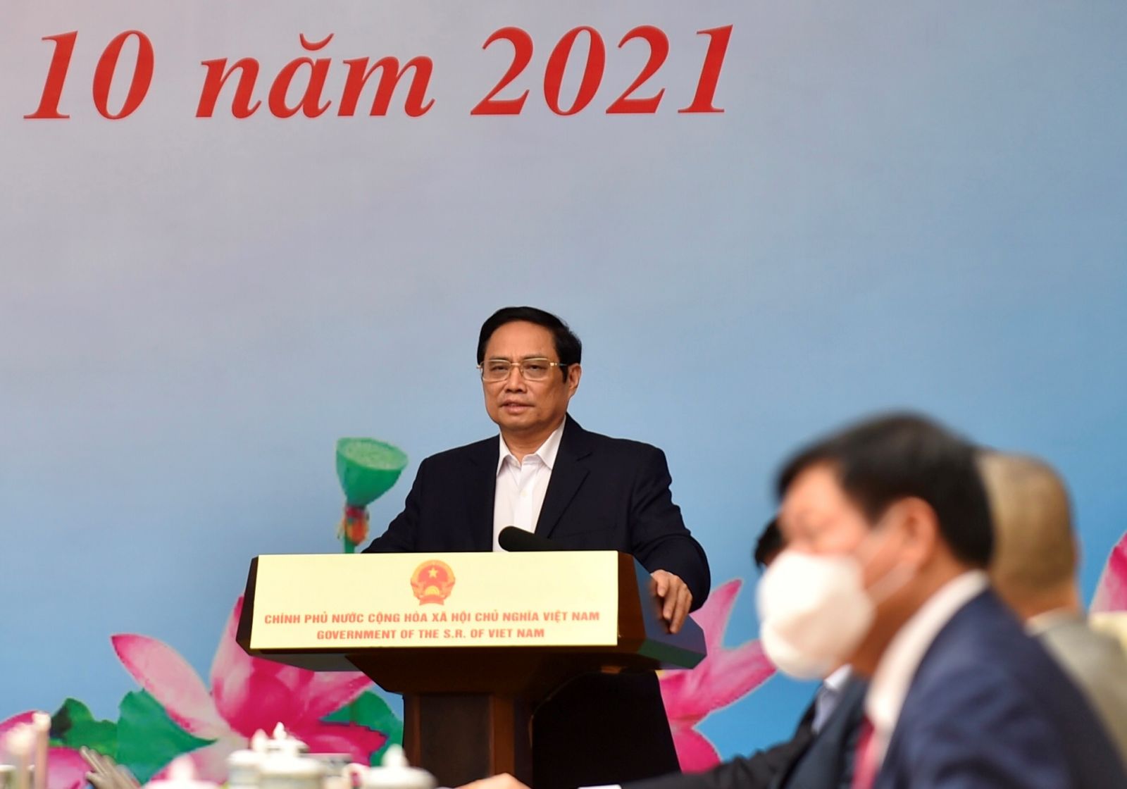 Thủ tướng Phạm Minh Chính: Các bộ, ngành, địa phương hỗ trợ, tạo điều kiện, bảo đảm các điều kiện thuận lợi kể cả về vật chất và tinh thần để các lực lượng tuyến đầu hoàn thành tốt nhất nhiệm vụ cao cả của mình - Ảnh: VGP/Nhật Bắc