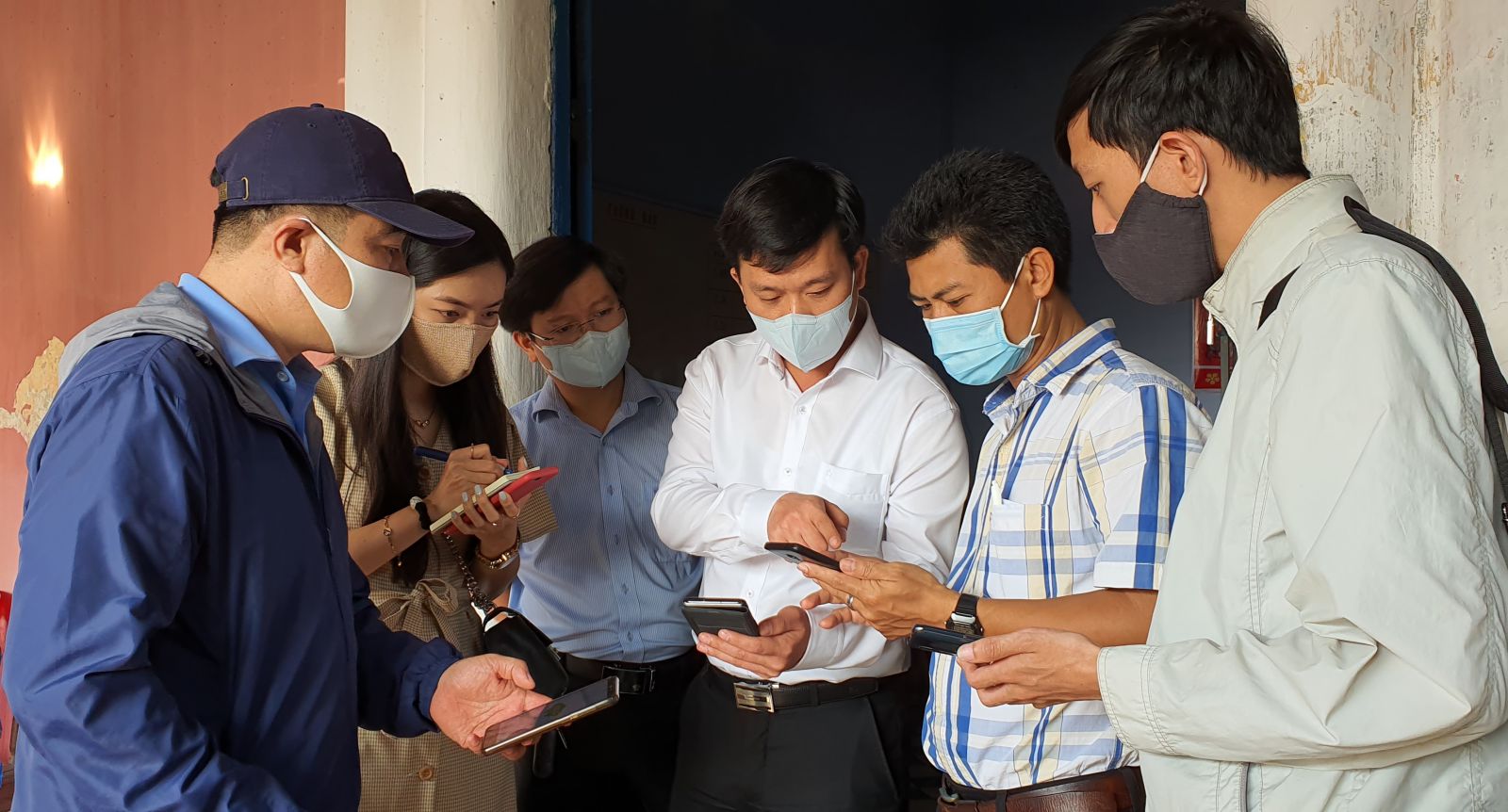 Giám đốc Sở Thông tin và truyền thông Nguyễn Xuân Sơn (áo trắng) hướng dẫn nhân viên tại chốt Kiểm soát y tế cách cập nhật thông tin khai báo y tế qua ứng dụng trên smartphone