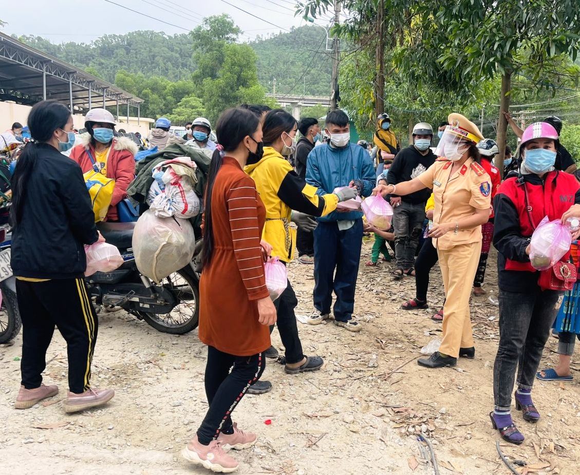 Lực lượng chức năng huyện Phú Lộc hỗ trợ bà con các suất ăn, nước uống miễn phí tại chốt kiểm soát số 5