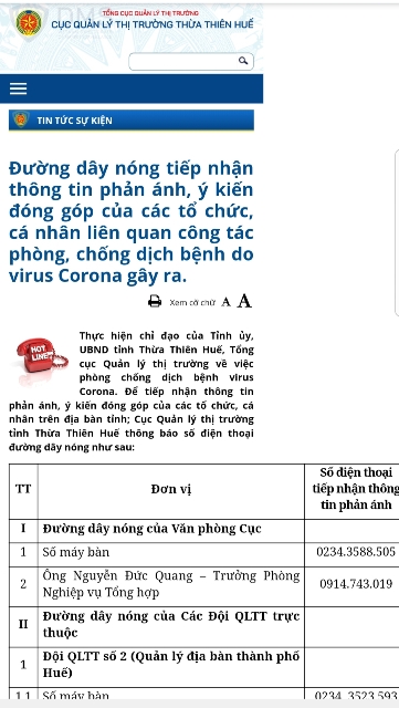 Cục QLTT tỉnh thành lập đường dây nóng tiếp nhận thông tin phản ánh liên quan đến dịch virus Corona
