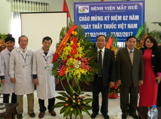 Chủ tịch UBND tỉnh NGuyễn Văn Cao (thứ 3 từ phải sang) thăm, tặng hoa chúc mừng tập thể cán bộ Bệnh viện Mắt Huế