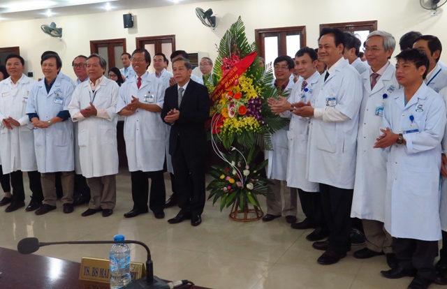 | Ông Phan Ngọc Thọ tặng hoa chúc mừng và chụp ảnh lưu niệm đến tập thể Bệnh viện Trung ương Huế |