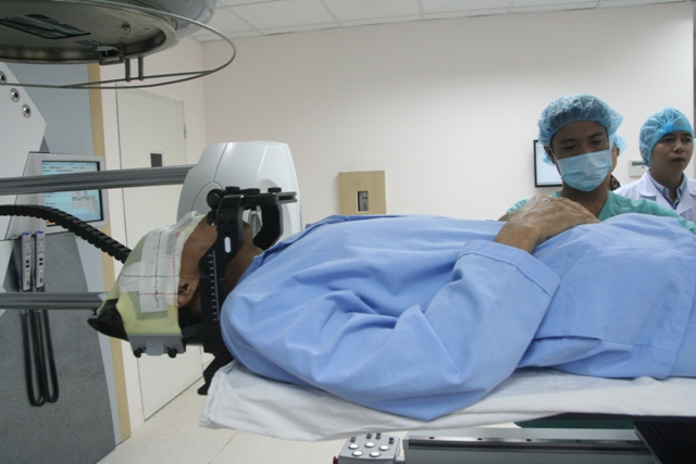 Ông Hoàng Văn V. (65 tuổi, đến từ Hà Nội) bị khối u ở góc cầu tiểu não đang được xạ trị máy Axesse Elekta tại BV Trung ương Huế