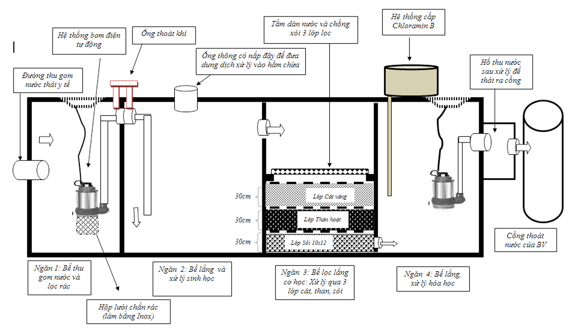 Sơ đồ diễn giải chi tiết hệ thống xử lý nước thải Bệnh viện cải tiến 4 ngăn