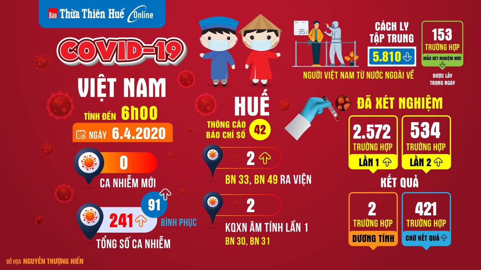 Số lượng được cách ly y tế tại BVTW Huế cơ sở 2 là 12 người; cách ly tập trung người Việt Nam từ nước ngoài về 5.810 người (do có gần 600 người hết hạn cách ly đã trở về địa phương), đang được bố trí ở tại Trường Quân sự tỉnh, Trường trung cấp Công nghệ số 10, Trường CĐ Nghề 23, Trường Đào tạo và Phát triển Nguồn nhân lực Ngân hàng TMCP Công Thương Việt Nam, Trường Nghiệp vụ Thuế, Trung tâm Giáo dục Quốc phòng, Ký túc xá Trường Bia; Trung đoàn 176.