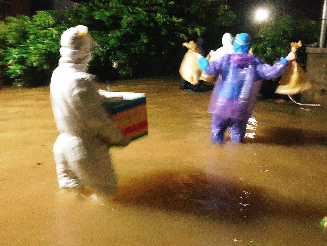 Lực lượng chức năng tiến hành lấy mẫu, truy vết ngay trong đêm mưa. Ảnh: NĐB