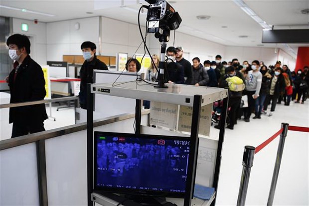 Kiểm tra y tế qua màn hình tại sân bay Narita ở quận Chiba, ngoại ô Tokyo, Nhật Bản. (Ảnh: AFP/TTXVN)