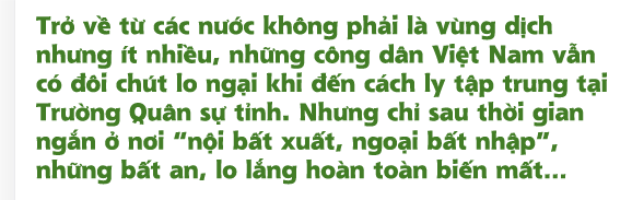 19h tối 19/3, khi chuyến xe cuối cùng trong ngày chở công dân Việt Nam trở về từ các nước không phải là vùng dịch đến Trường Quân sự tỉnh (Trường) thực hiện cách ly tập trung dừng bánh trước cổng Trường, gần 50 người với đủ sắc phục của ngành y tế, quân đội, công an đã có mặt ở vị trí được phân công. Mọi chuyện diễn ra trong nhịp nhàng và trật tự, bởi không tính những ngày trước, chỉ riêng hôm đó, họ đã 2 lần căng sức với phần việc tương tự, và lần này là lần thứ ba.