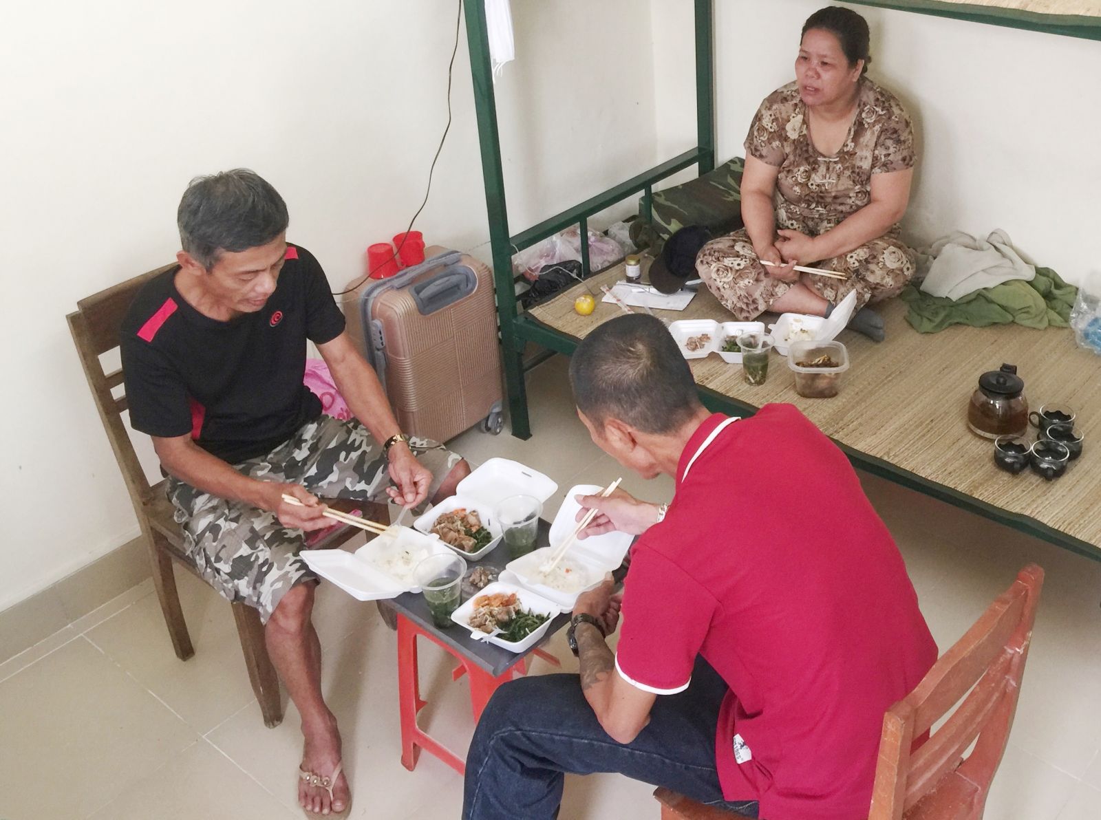 Ông T. (phải) nói: “Cơm một bữa bốn món, chỗ ở, nhà vệ sinh sạch sẽ, nước nóng lạnh đầy đủ. Miễn phí như rứa còn đòi cái chi”
