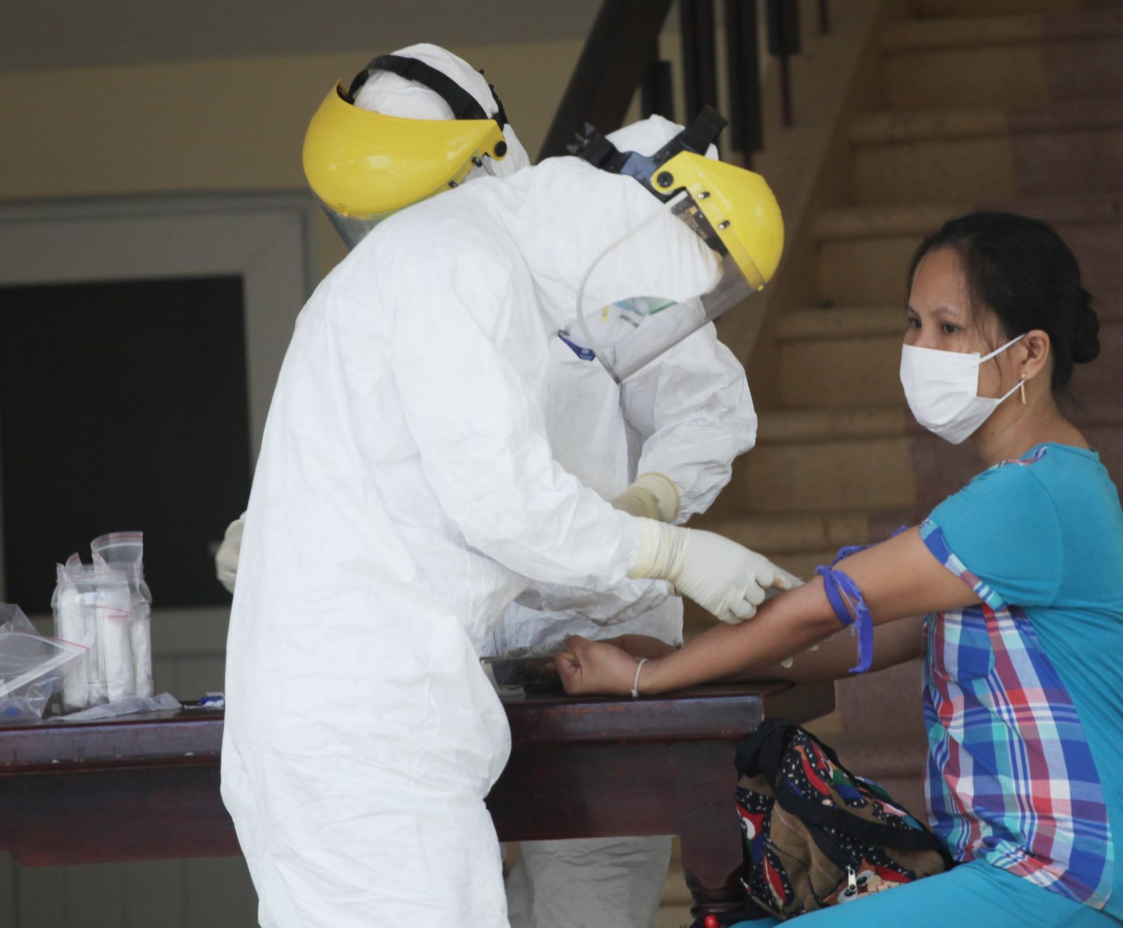 Sau giờ nghỉ trưa trong tiếng ve râm ran một góc trời, đến đầu giờ chiều, cả khu cách ly chợt xôn xao khi hơn 20 người trong trang phục bảo hộ y tế lần lượt đến từng phòng đo thân nhiệt, phun thuốc sát khuẩn, tiếp đó là kiểm tra dịch tể, lấy mẫu máu từng người đang cách ly tập trung.