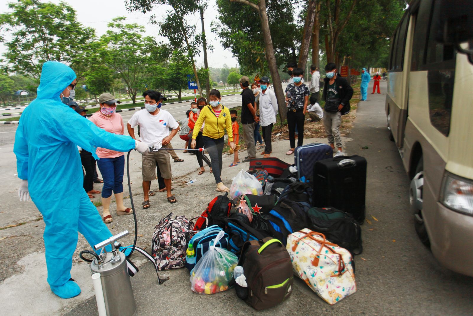 Từ ngoài cổng cho đến trước khu vực cách ly tập trung bên trong khuôn viên Trường, tùy theo chức năng, vị trí được phân công, họ chia nhau người vòng trong, người vòng ngoài, người tiếp xúc trực tiếp hoặc gián tiếp để thực hiện nghiêm cẩn, chu đáo từ quy trình sát khuẩn ngay khi xe vừa dừng bánh cho đến lúc đoàn người an vị trên từng chiếc giường trong khu vực cách ly tập trung.