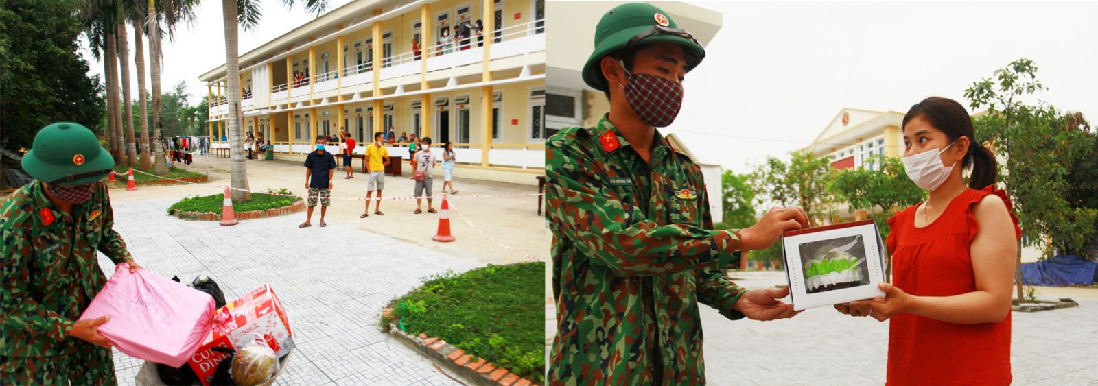 Đang muốn tiếp tục câu chuyện thì từ ngoài sân, một bóng áo lính đang lụi hụi đẩy chiếc xe rùa đi vào, bên trên chất đầy những trái cây, bánh kẹo…: “Mời chị/anh… ở phòng… ra nhận quà người thân gửi”… Và trong không khí có chút chộn rộn ấy, bất chợt từng tràng vỗ tay vang lên khuấy động cả khu cách ly khi anh lính cẩn thận lấy từ xe rùa chiếc bánh kem – món quà sinh nhật người thân gửi cho một phụ nữ đang từ trên tầng 2 khu cách ly đi xuống với nét mặt rạng ngời…