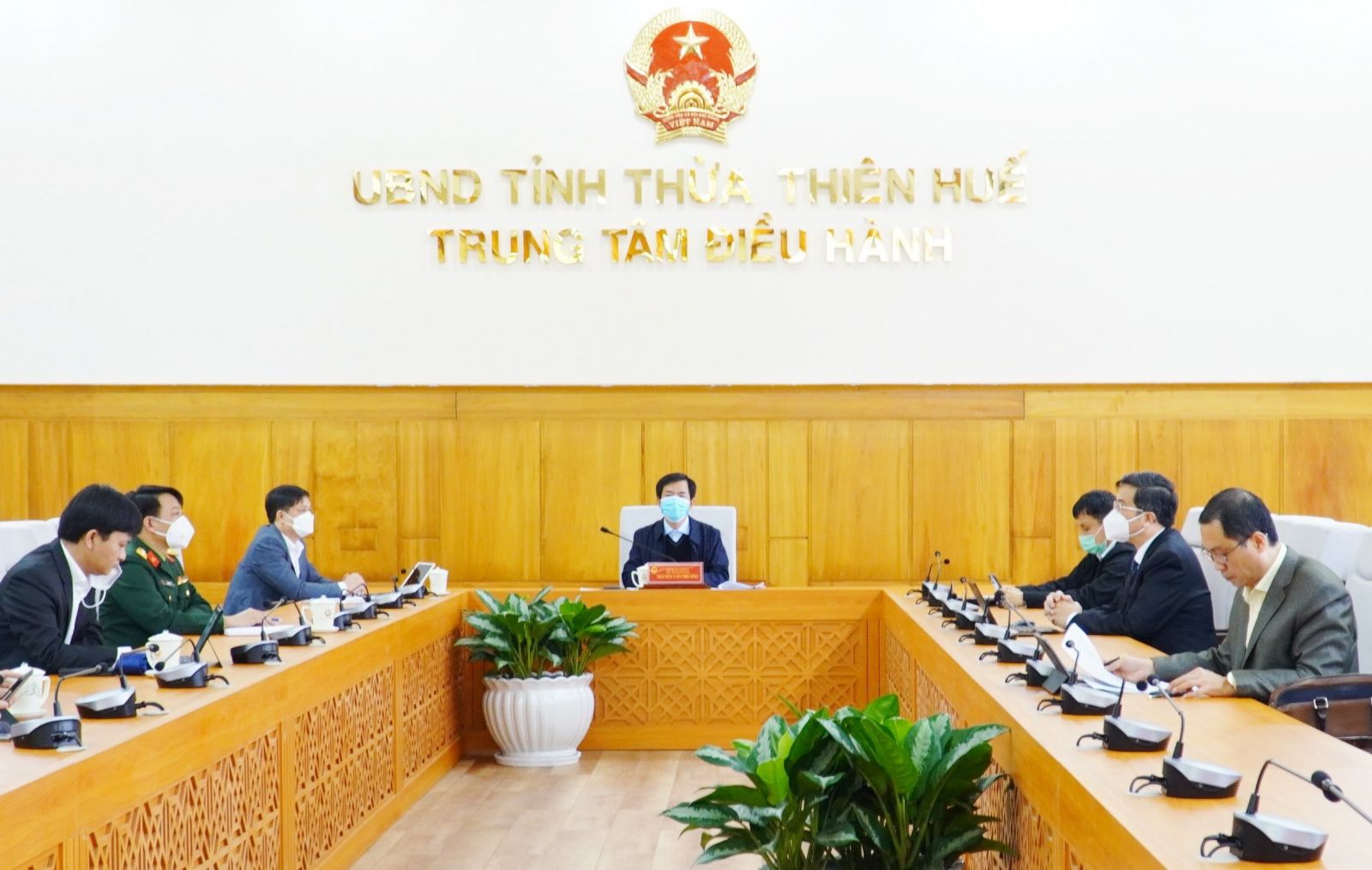 Chủ tịch UBND tỉnh Nguyễn Văn Phương và các thành viên Ban Chỉ đạo phòng chống COVID-19 tỉnh tại điểm cầu Thừa Thiên Huế