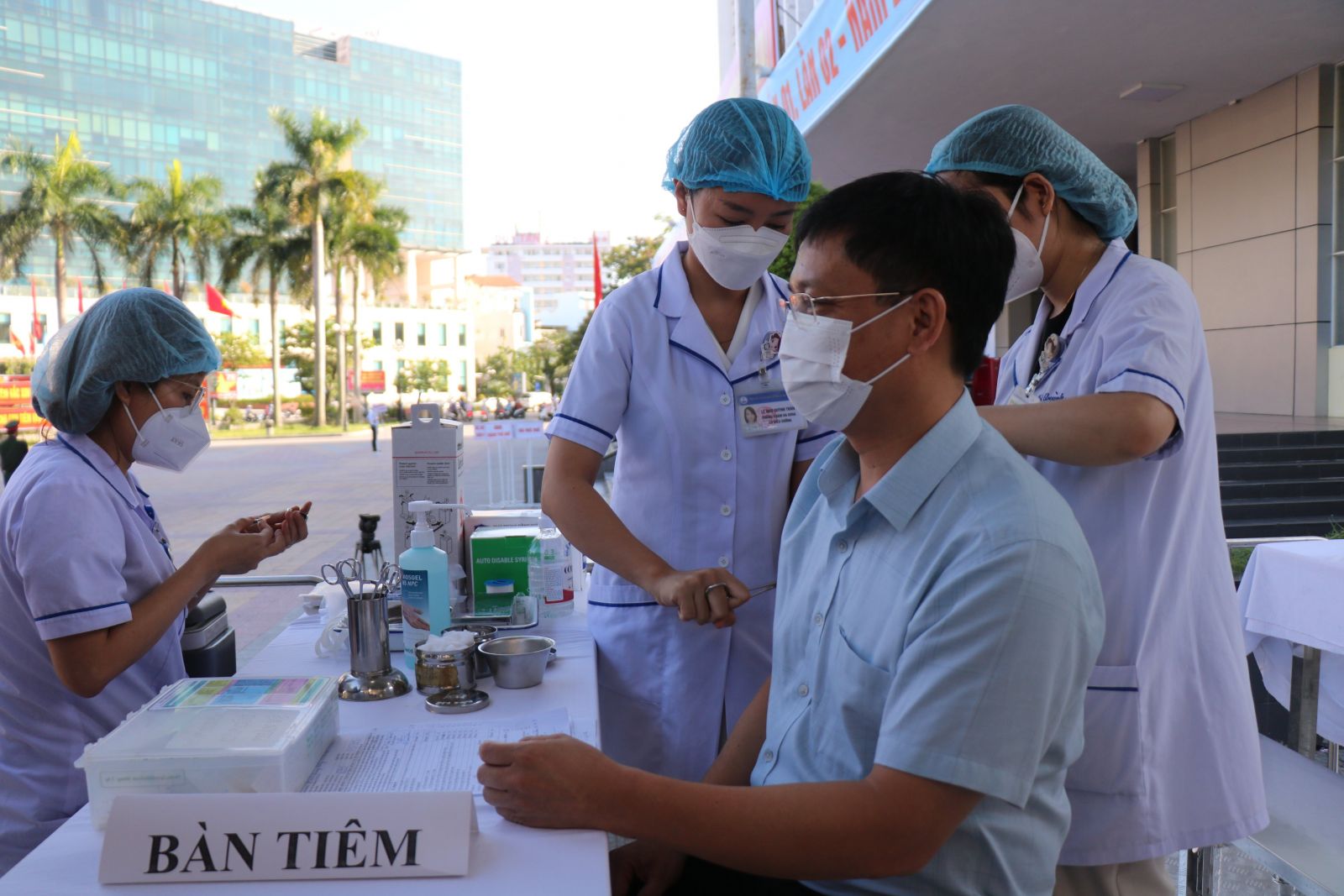 Ông Nguyễn Thanh Bình - Phó Chủ tịch UBND tỉnh, Phó Trưởng ban Thường trực BCĐ phòng, chống dịch COVID-19 tỉnh hưởng ứng tiêm mũi 4 ngay tại lễ phát động