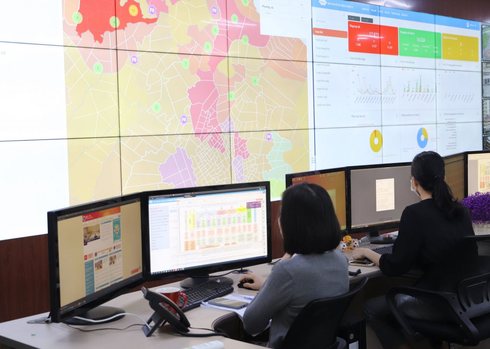 Cán bộ Trung tâm giám sát, điều hành đô thị thông minh phân tích các dữ liệu về phòng chống dịch bệnh COVID-19 của tỉnh
