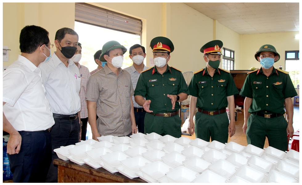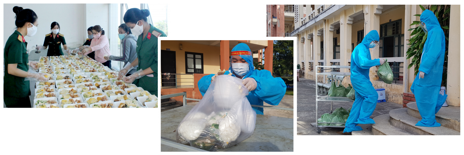 Đặc biệt, Bộ CHQS tỉnh còn lập các bếp ăn tập trung ngoài khu cách ly phục vụ cho nhiều khung. Bếp ăn tập trung tại Trường ĐH Luật (ĐH Huế) phục vụ 12 ngàn suất ăn mỗi ngày, bếp ăn xã hội hóa tại Trường THCS Nguyễn Tri Phương (cũ) phục vụ gần 3.000 suất ăn cho các khung cách ly lân cận. Bếp ăn do quân đội phụ trách giám sát; các đoàn thể Liên đoàn Lao động, Hội Phụ nữ, Hội Nông dân, Đoàn Thanh niên… phụ trách sơ chế, nấu nướng, đóng gói.