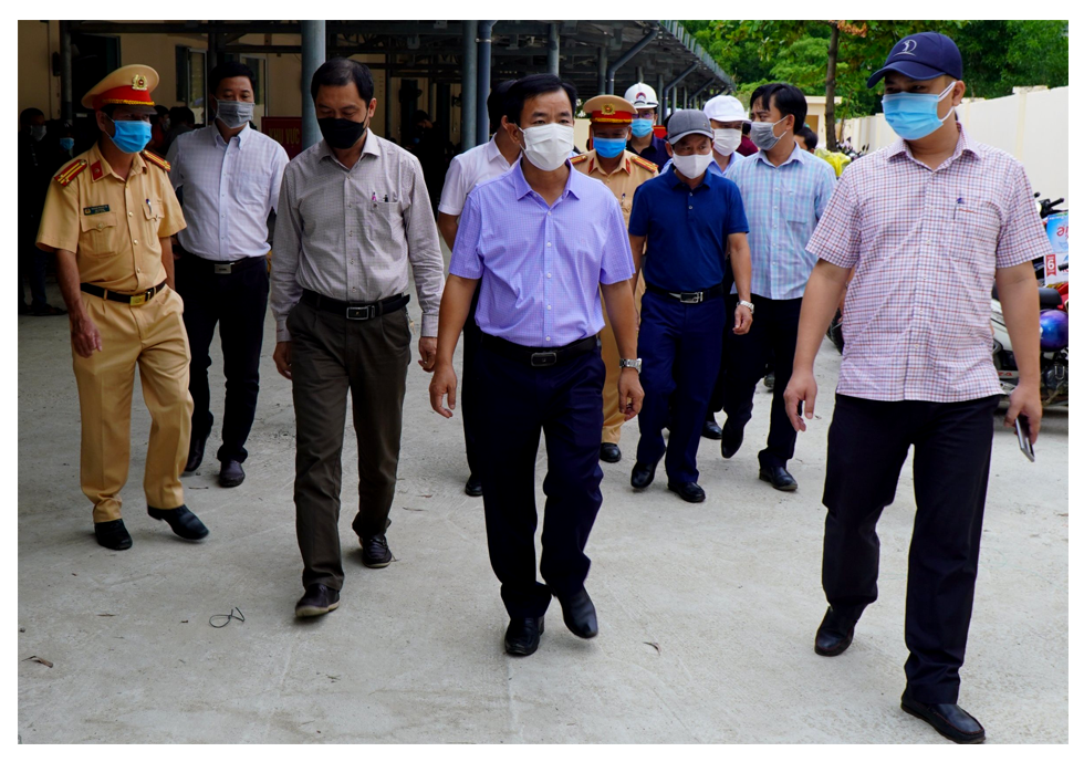 Chủ tịch UBND tỉnh (hàng đầu thứ hai từ phải sang) cùng đoàn kiểm tra chốt y tế đóng trên địa bàn huyện Phú Lộc