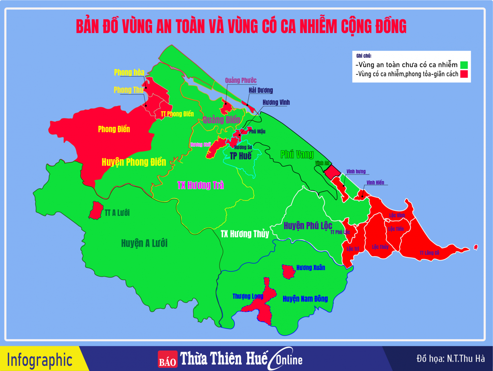Nhìn vào bản đồ vùng an toàn và vùng phong tỏa - giãn cách, tỷ lệ “vùng xanh” vẫn chiếm đa số, điều này cho thấy hiệu quả trong công tác phòng chống dịch thời gian qua của tỉnh Thừa Thiên Huế.